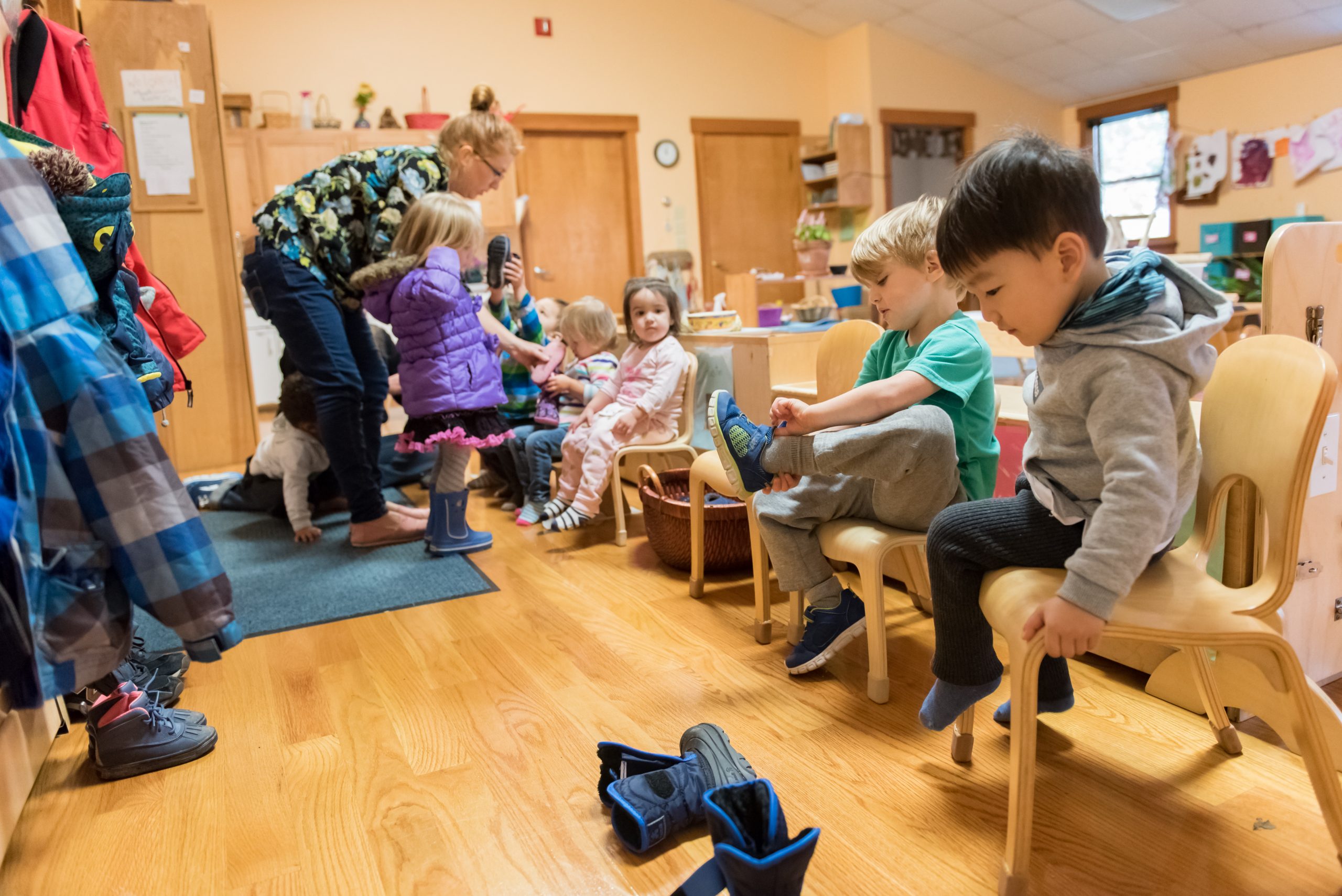 Aside from their own classroom community, Montessori toddlers develop special relationships with older students as they visit from their classrooms to read stories and get them ready for outdoor adventures.